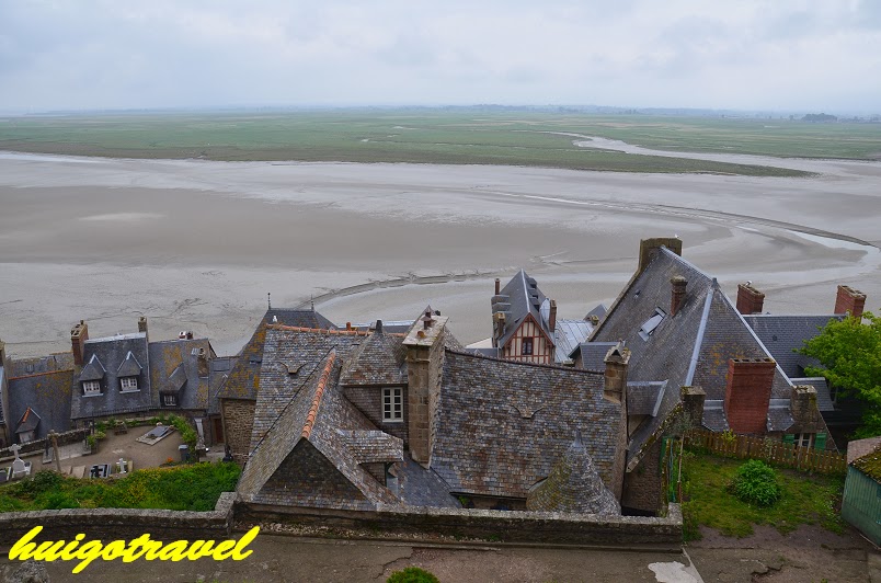 這時應該是退潮,河水低落和堤道有二三公尺的落差。聖米歇爾山是法國諾曼第附近,距海岸約1公里的岩石小島,為法國旅遊勝地,被稱作「海上金字塔」,也是天主教徒的朝聖地,山頂建有著名的聖米歇爾山修道院,聖米歇爾山及其海灣於1979年被聯合國教科文組織列為世界遺產。(維基百科)